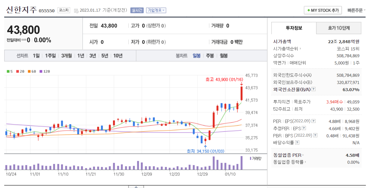 오늘은 신한금융지주 주가 분석 및 전망 그리고 배당금 등 기타 주식 정보를 작성해보려고 합니다.
