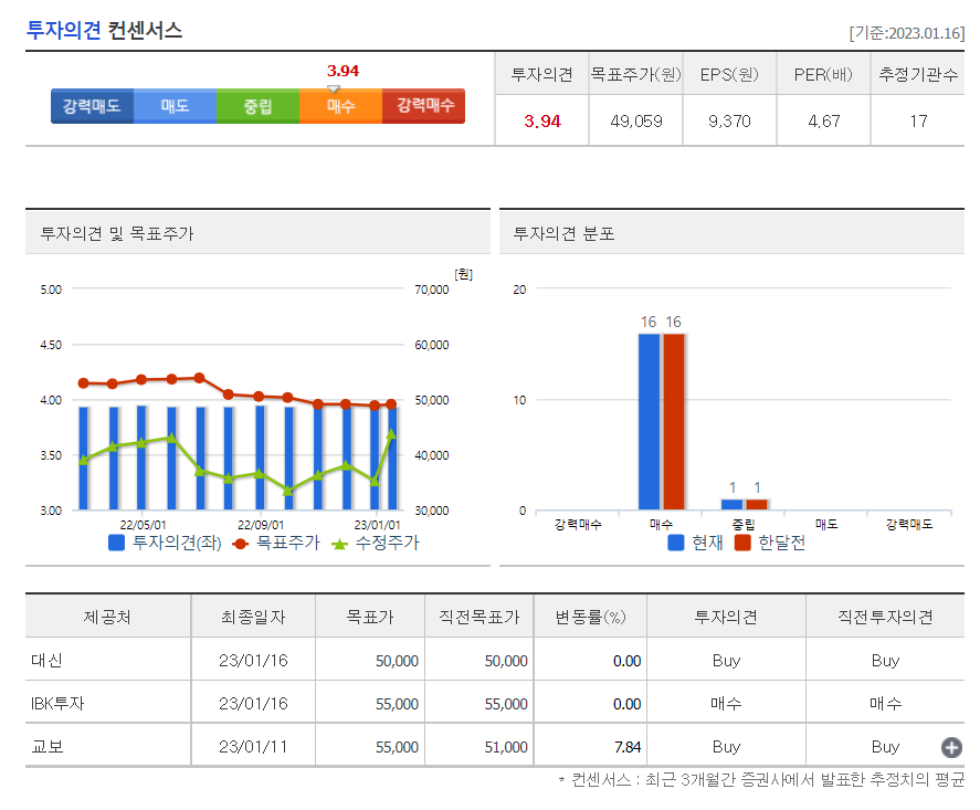 목표주가는 49,059원으로 현재주가 43,800원에서 약 15% 정도 상승여력이 있다고 생각하는 것 같습니다.