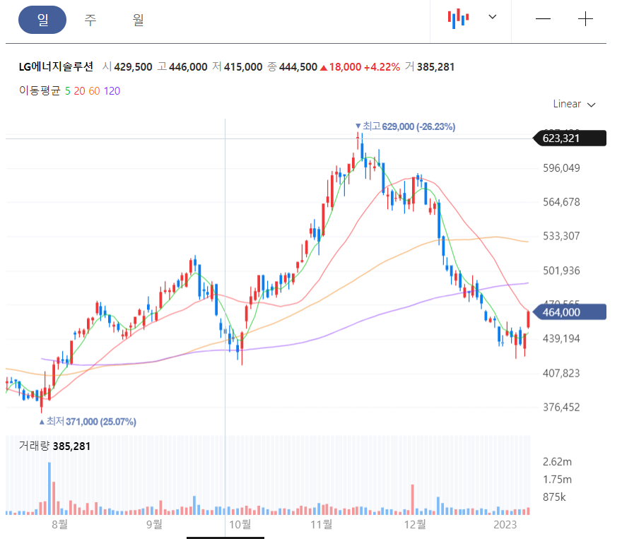 엘지에너지솔루션은 작년 7월 기관 보호예수 물량이 풀리면서 최저 35.2만원까지 내려갔다가 몇개월 후 62.9만원까지 오른후 현재는 일부 조정을 받아 46.4만원으로 가격을 받고 있습니다.
